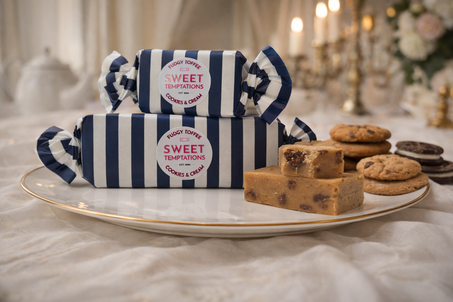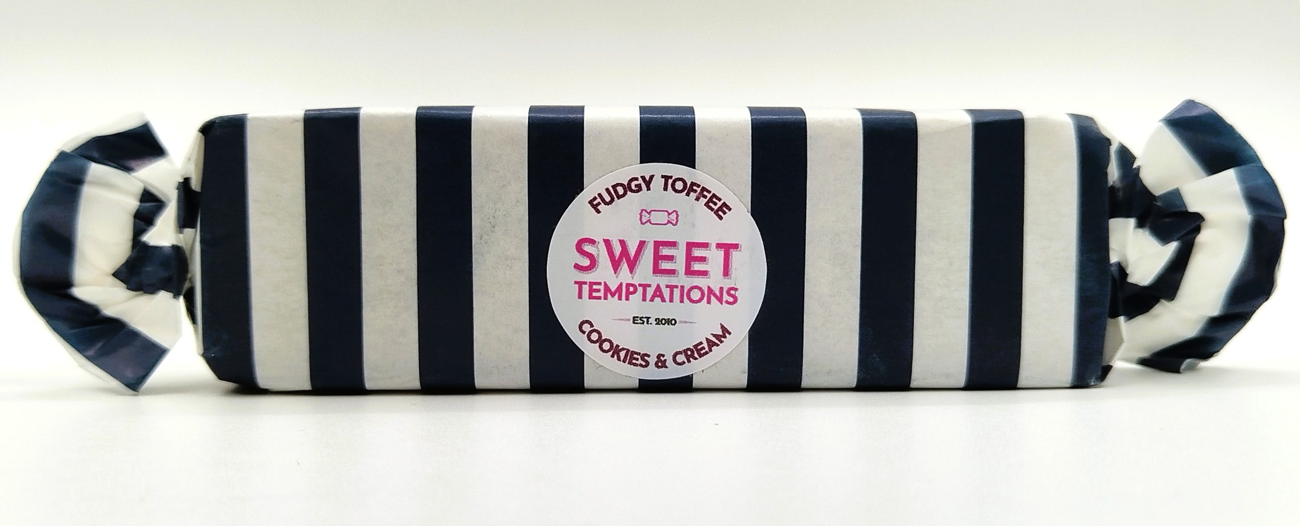 A dreamy fusion of creamy vanilla fudge and crunchy cookie bits, this toffee bar delivers a perfect balance of smooth and crumbly textures. Each bite offers that classic cookies and cream indulgence, wrapped in a bright candy-striped wrapper for a fun, nostalgic touch.