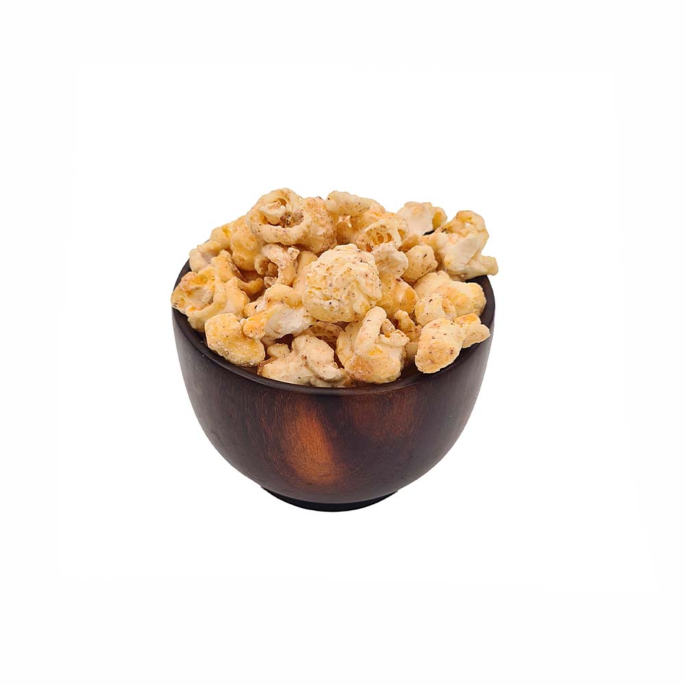 Freshly popped popcorn with a caramel, white chocolate and cinnamon coating.